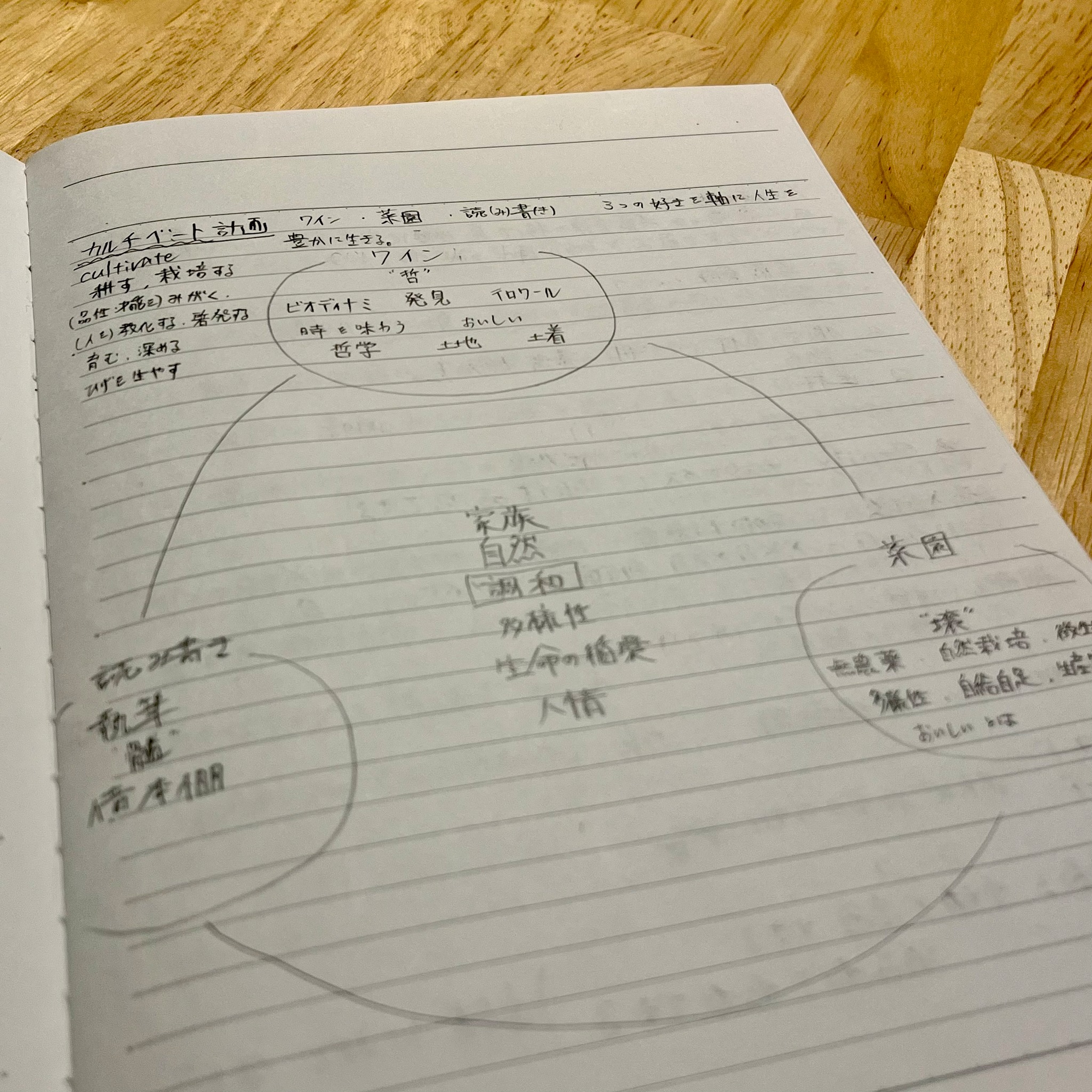 一冊のノートを取り出しまして、ページの中央上部に「ワイン」、右側下部に「菜園」、左側下部に「読み書き」の単語をそれぞれ中くらいの大きさの丸で囲います。カテゴリー分け。関心事の中で一生の生業にしても良さそうな3カテゴリー。